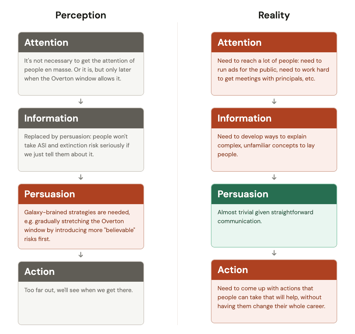 Chart synthesized from the section "The Simple Pipeline" of Gabriel Alfour's post on The Spectre haunting the "AI Safety" Community. It's a common perception that one cannot communicate directly to lay people about extinction risks from ASI, because they would never get it. Instead, one must cook up sophisticated persuasion schemes. Based on our experience, this idea is just plainly wrong. Just tell the truth!