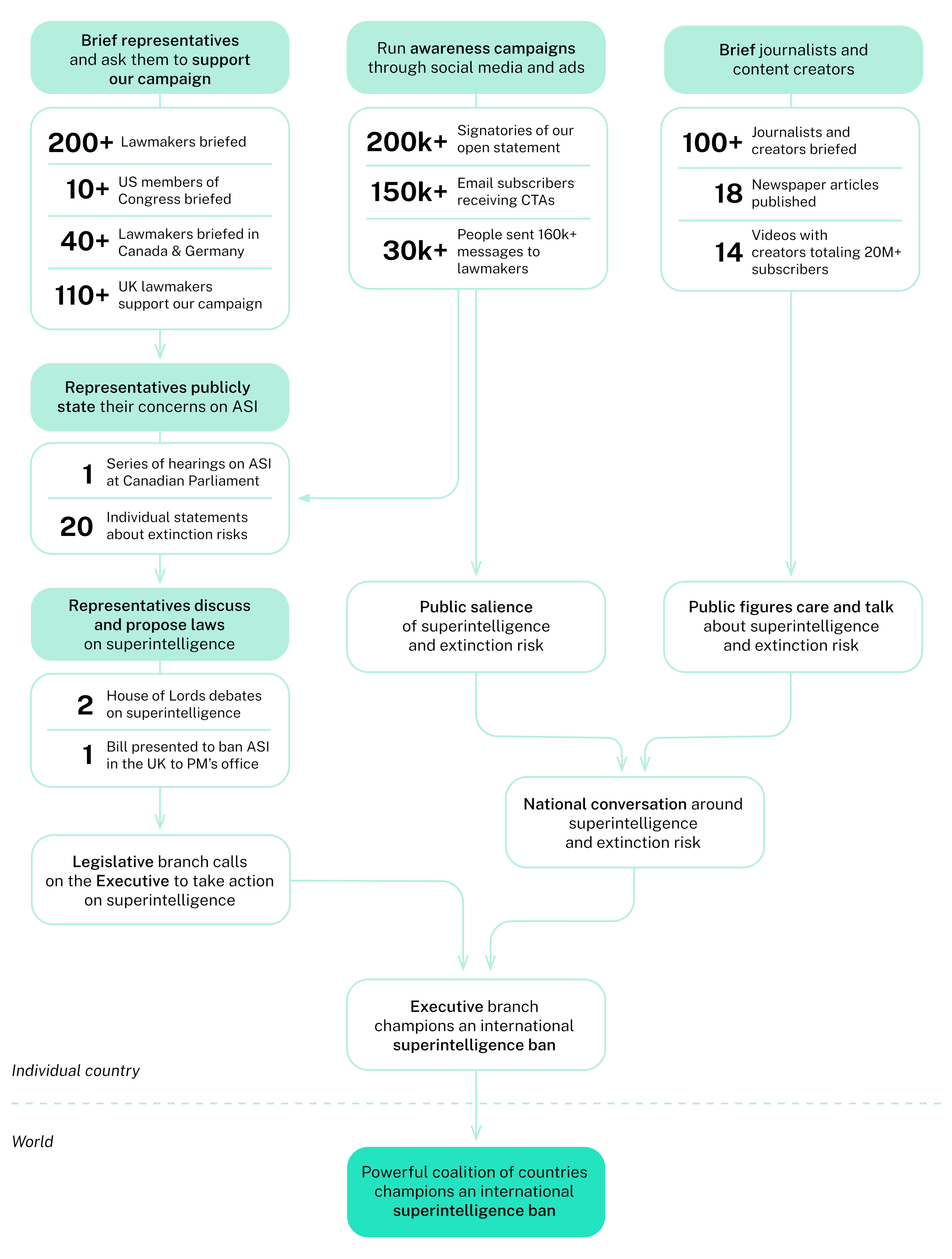 ControlAI takes a different approach, one that straightforwardly allows scaling up workstreams once they've been set up. Whenever we have a goal that is too far off to tackle directly, we break it down into the most ambitious possible intermediate goal that we think we can act on. Crucially, we choose intermediate goals whose progress we can measure as hard numbers. In this way, we're approximating sales funnels, the gold standard for how companies handle sales.